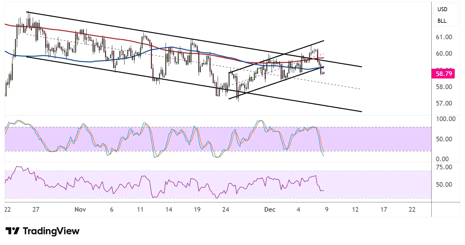如果原油未能守住57美元支撑位,可能会出现更深的抛售,逼近56美元手把或更低。另一方面,若当前水平强劲反弹,价格可能再次试探破损通道支撑作为阻力。