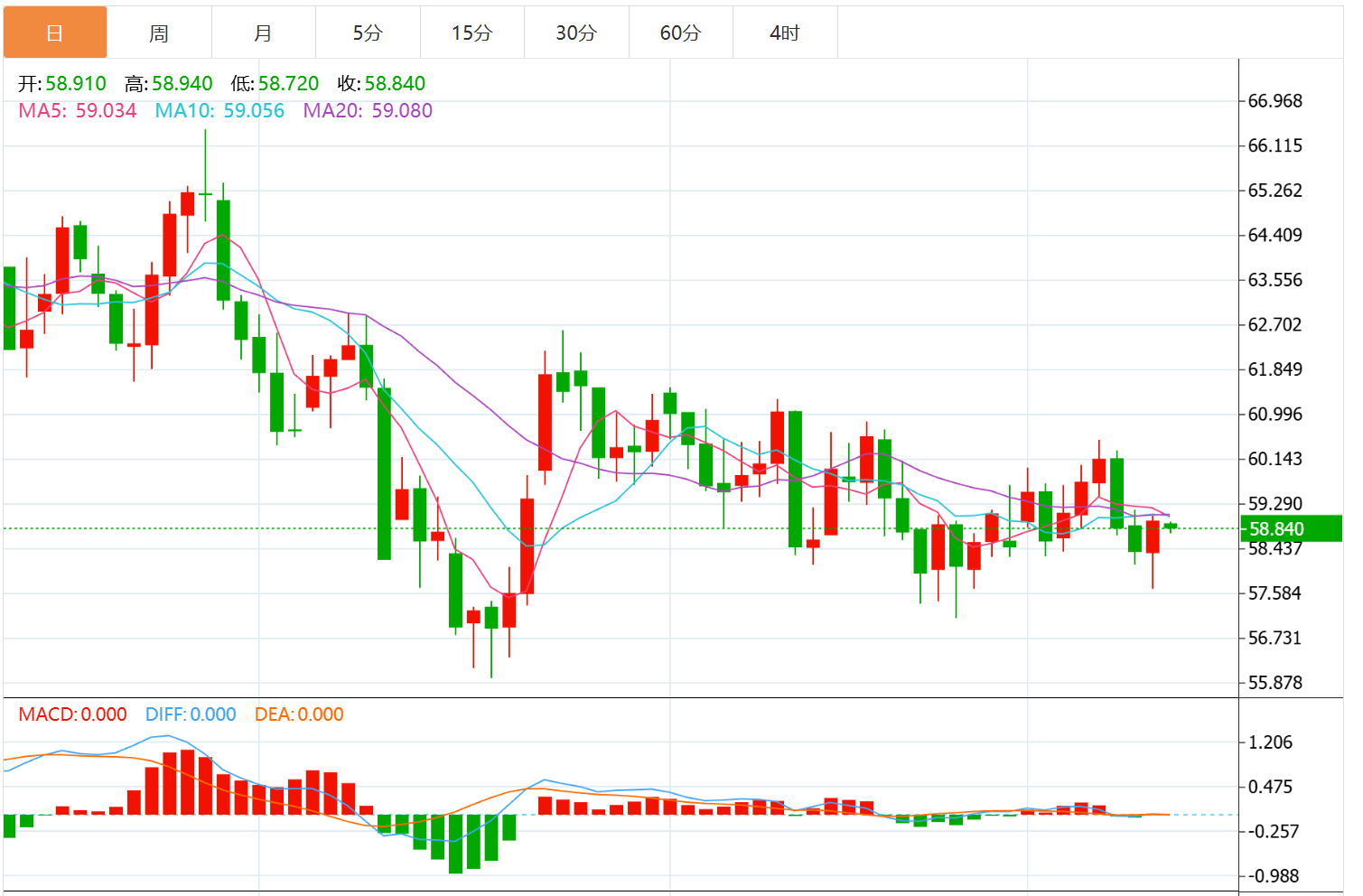 从技术走势观察,WTI价格继续在58—60美元区间窄幅震荡,K线形态显示多头力量有限。价格多次在60美元附近遇阻,而下方58美元形成阶段支撑,短期呈现弱势横盘形态。