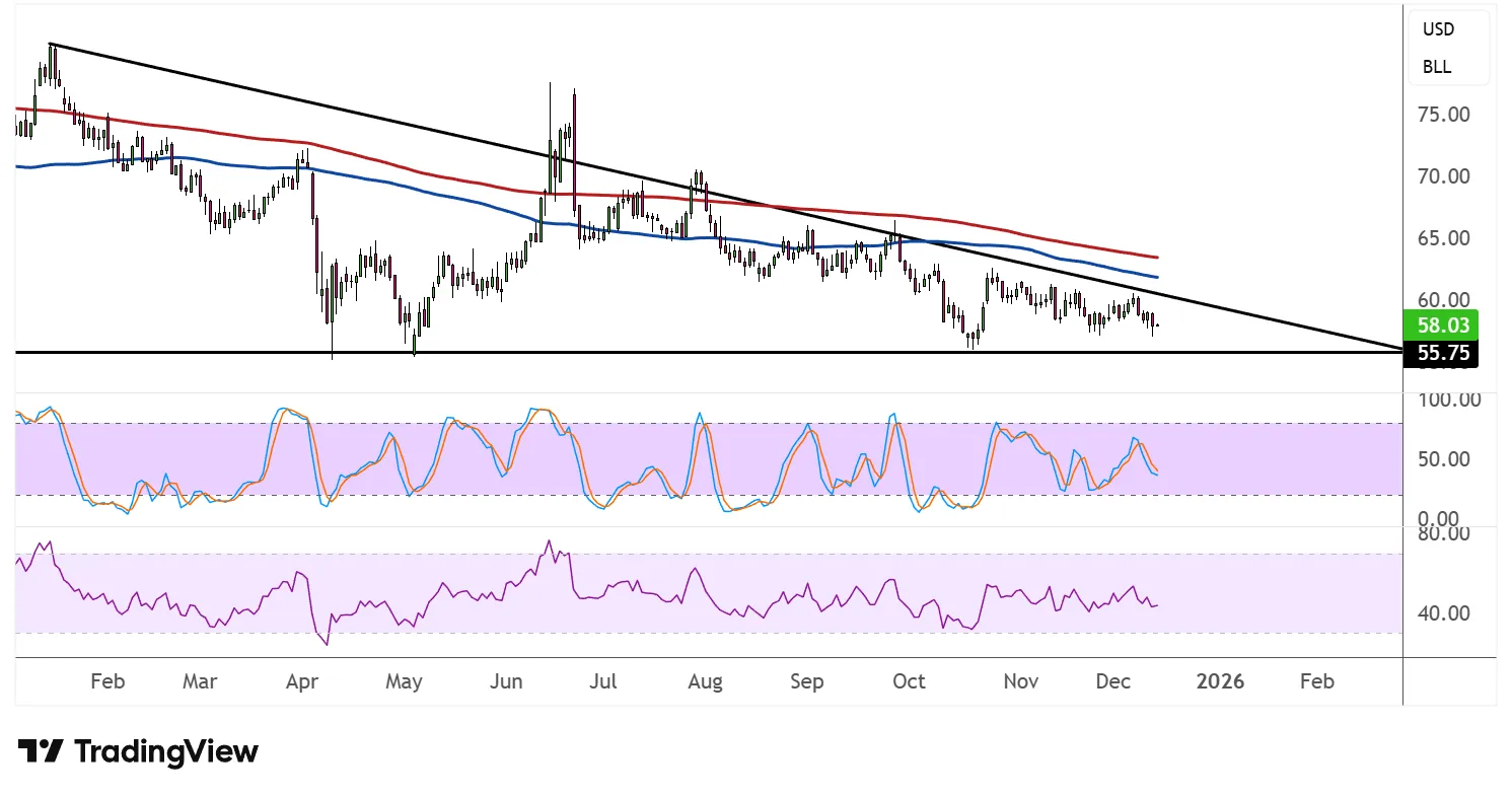 价格目前交易价约为每桶58.03美元,徘徊在自2025年初以来一直持有的55.75美元水平支撑附近。