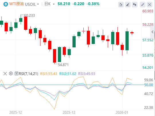 原油目前交易价格略低于58美元,当天下跌超过0.80%,且仍被限制在50日简单移动平均线(SMA)关键阻力区内。截至目前,WTI原油报价58.214美元,Brent原油报价62.62美元。