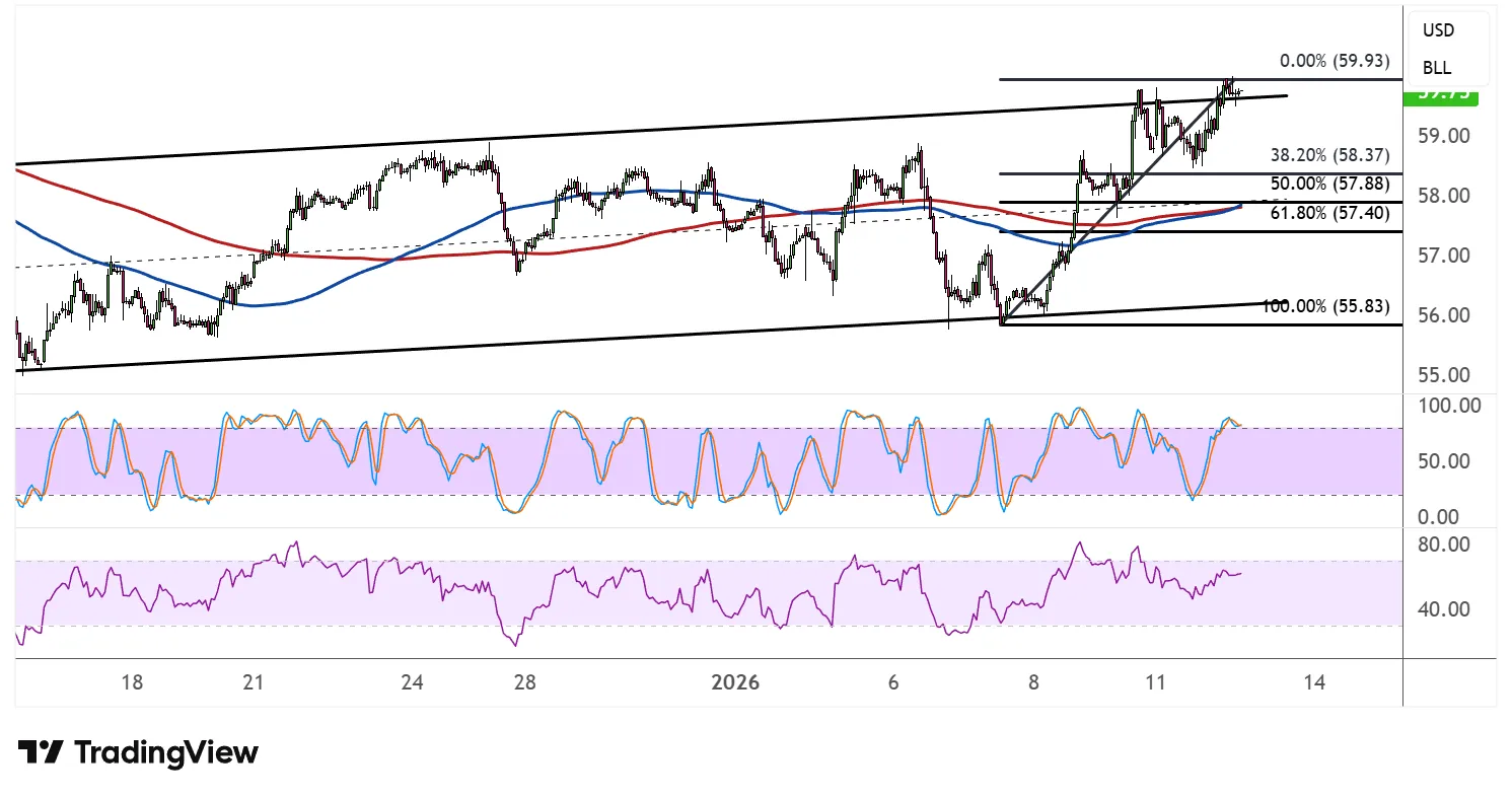 斐波那契回撤工具凸显了潜在支撑区,买家可能等待重新加入反弹。若从当前水平调整,原油可能回落至38.2%的斐尔布,报58.37美元,该位置与100均线(蓝线)动态支撑紧密相符。