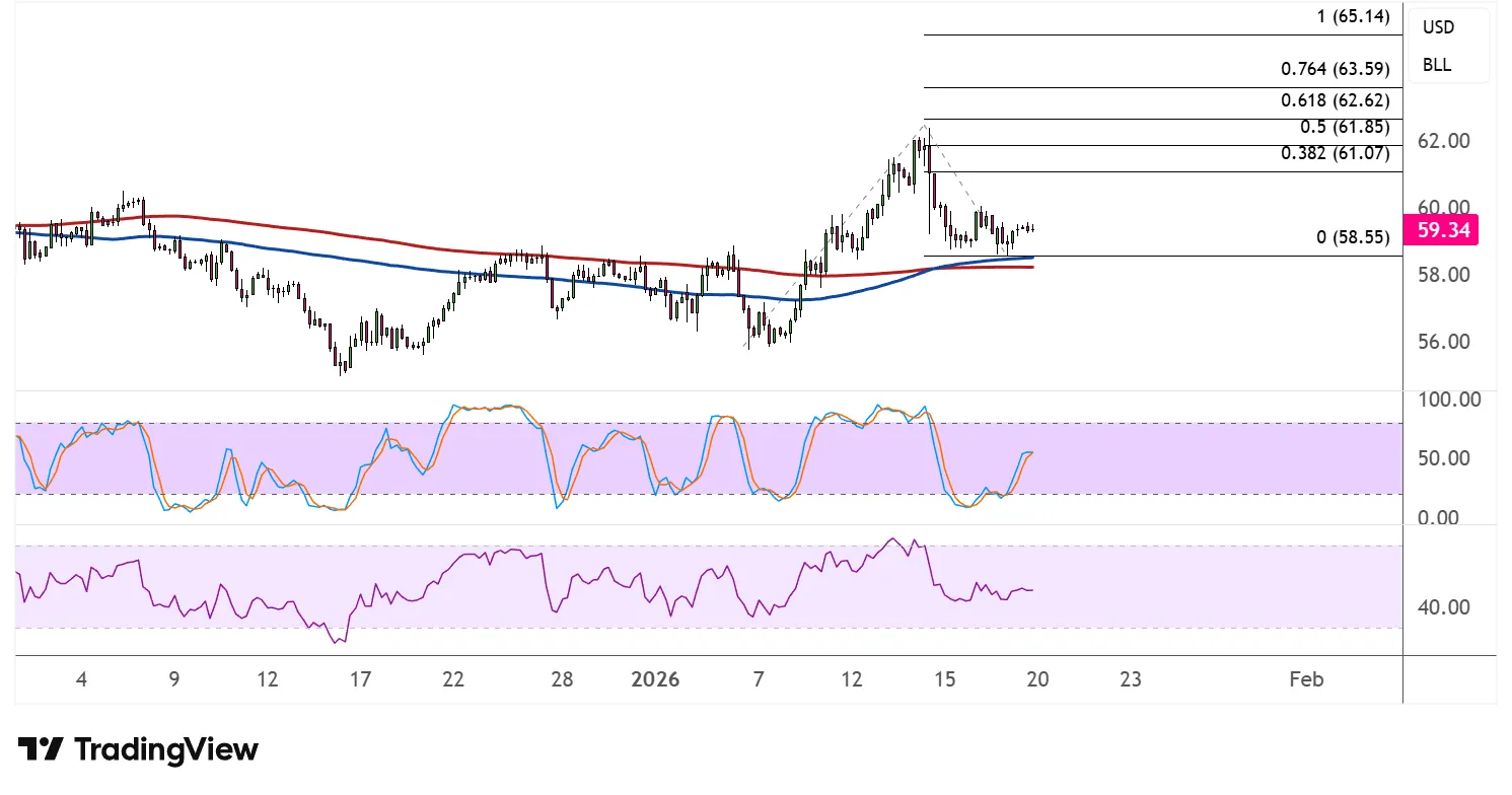 然而,随机指数目前徘徊在超买区间,反映买方疲劳,因此下跌意味着卖出压力会回归。振荡器在达到超卖区前有充足滑动空间,原油可能回落至移动平均线动态支撑或每桶58.55美元左右的波幅低点。