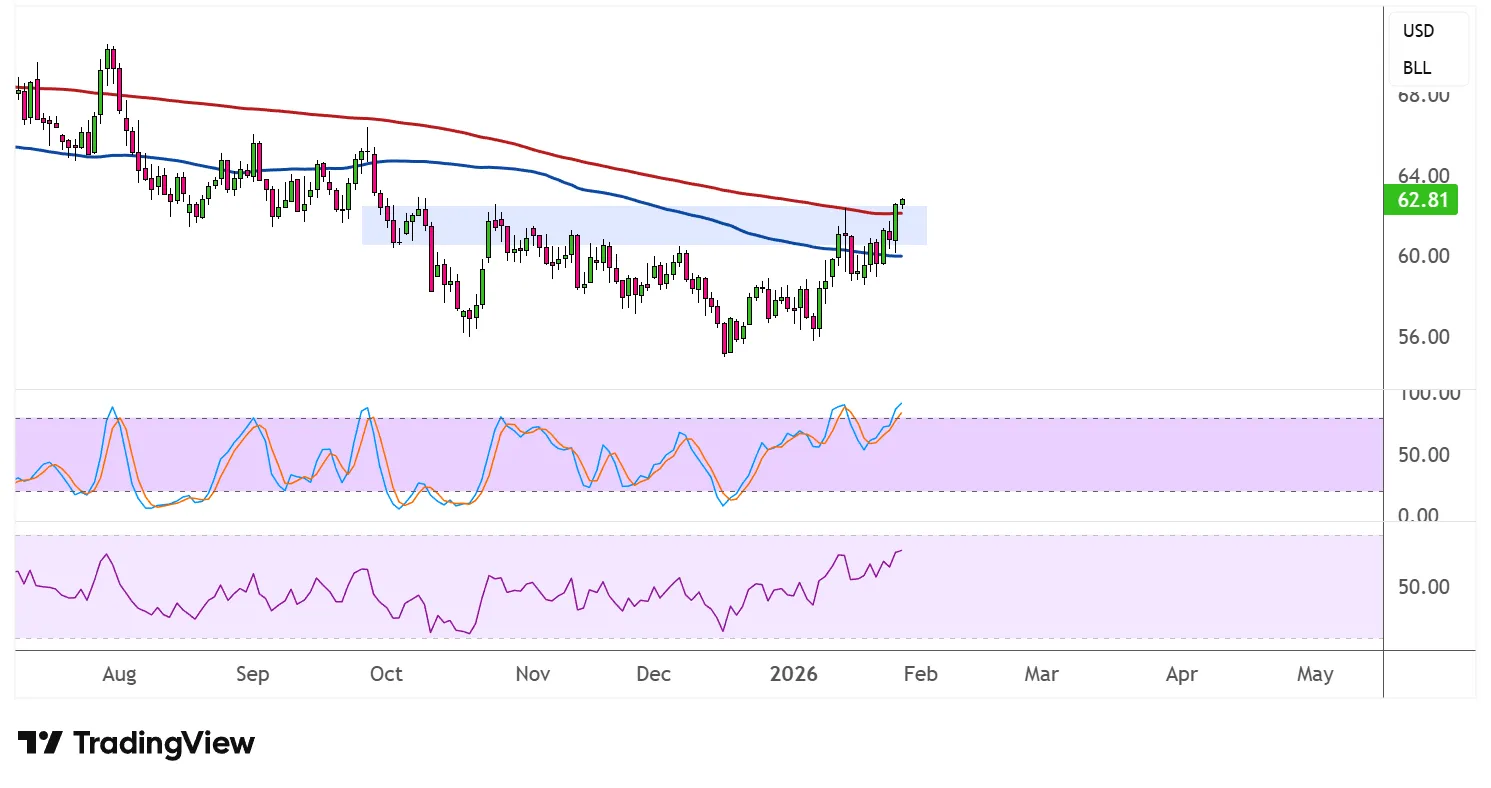 相对强弱指数(RSI)也在上涨,接近超买区,暗示原油可能需要喘息。不过,该指标在达到极端水平前仍有上升空间,因此涨幅可能进一步延伸,同时买方仍能掌控局势。