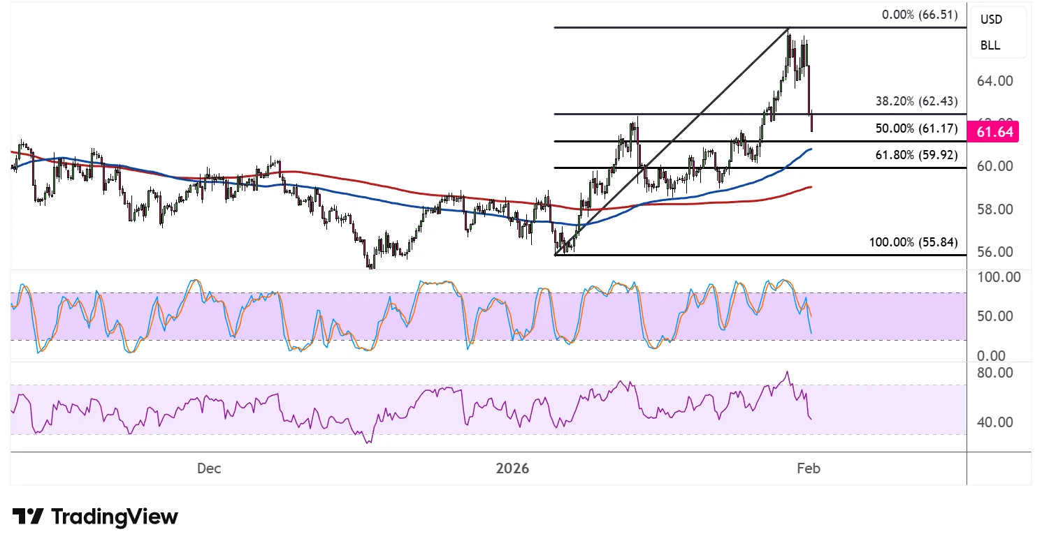 价格交易约61.64美元,已从近期高点回落。斐波那契回撤工具显示了可能重新点燃多头动能的关键支撑区。