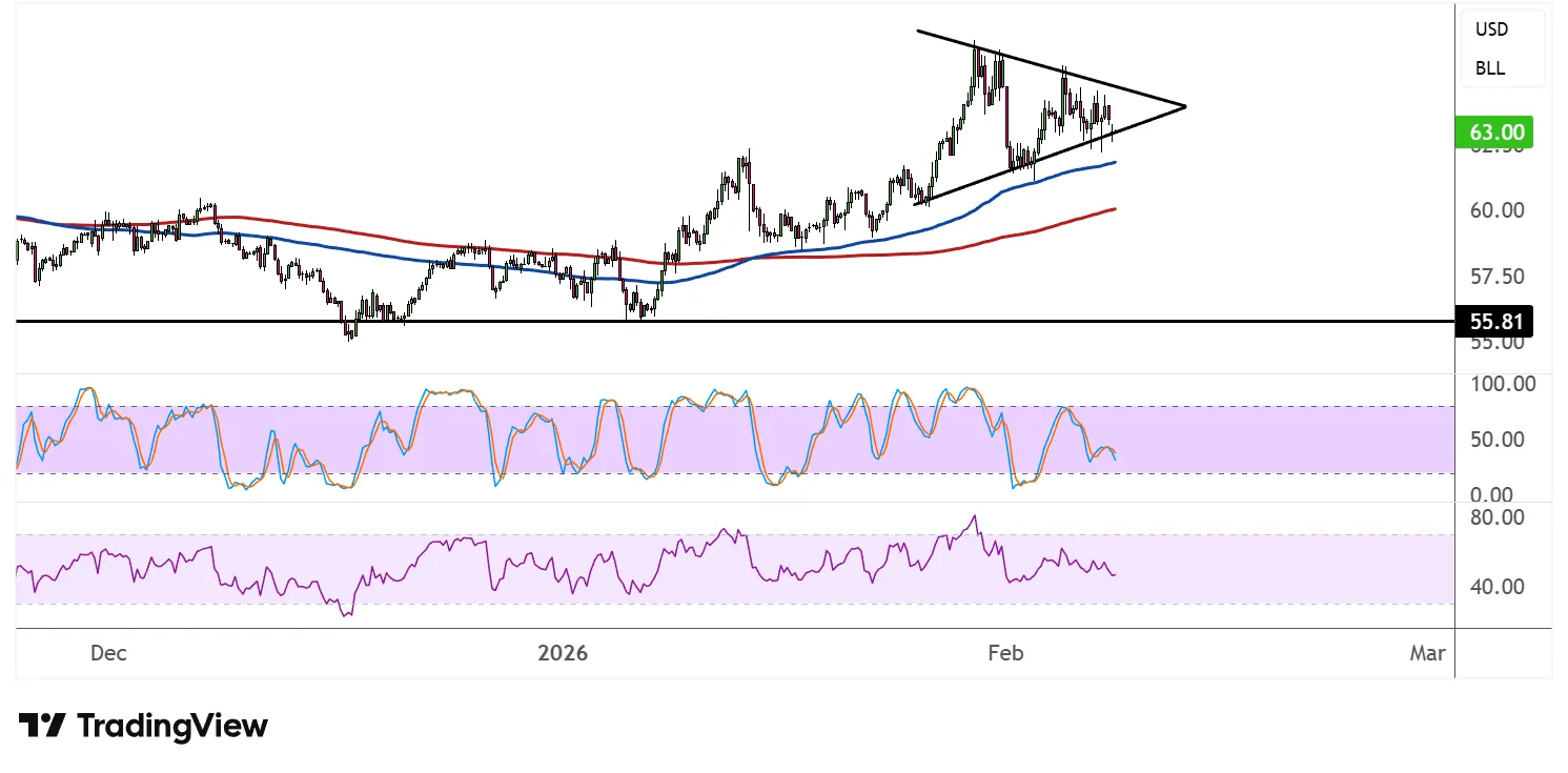 若该图形态出现下行突破,可能导致原油跌至与该形态相同的高度,原油价格可能跌至约每桶55.81美元左右的主要支撑位。该底线自2026年初以来一直存在,可能是近期上涨趋势的分界线。