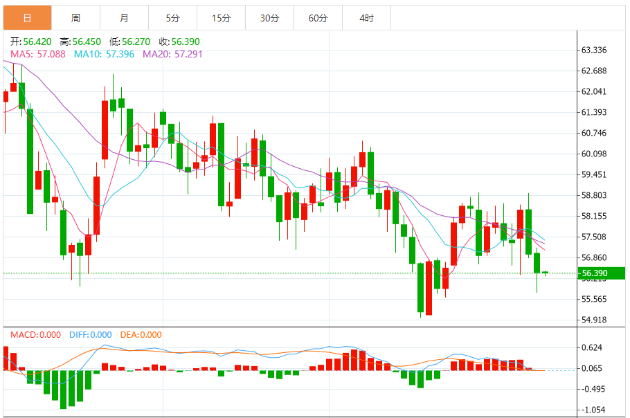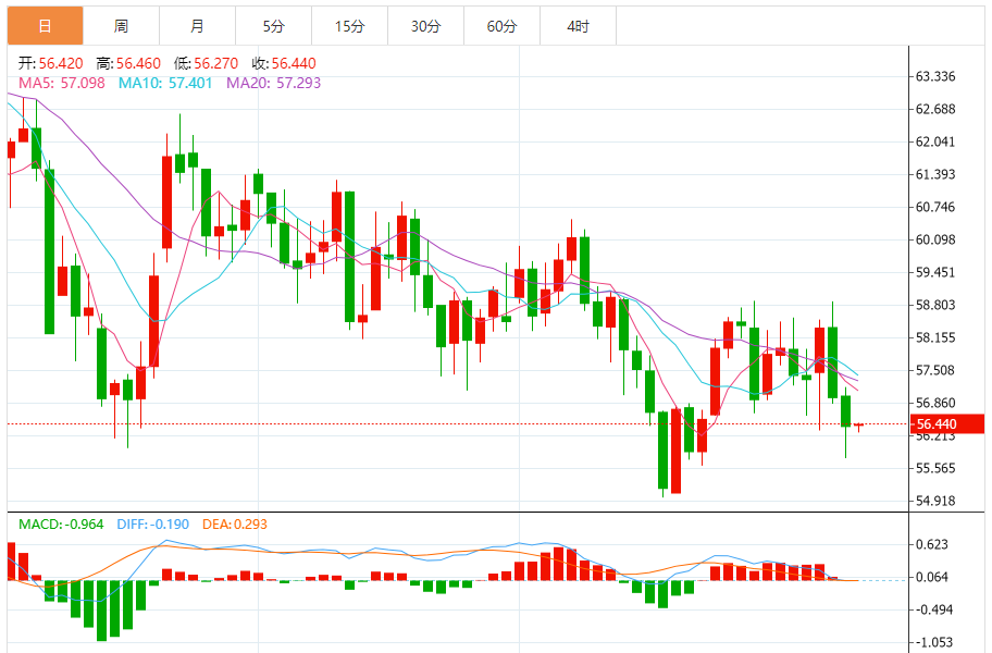 WTI原油继续在自十月以来一直存在的下降通道内下行,目前价格在每桶57-58美元的通道中间关注区下方徘徊。 该能源商品目前交易价格为56.41美元,未能维持在通道中间区域以上的涨势。这一回落表明,空头动能可能加剧,有可能将原油价格拉低至较低的斐波那契扩展水平。 61.8%的水平在$55.31,代表下一个支撑