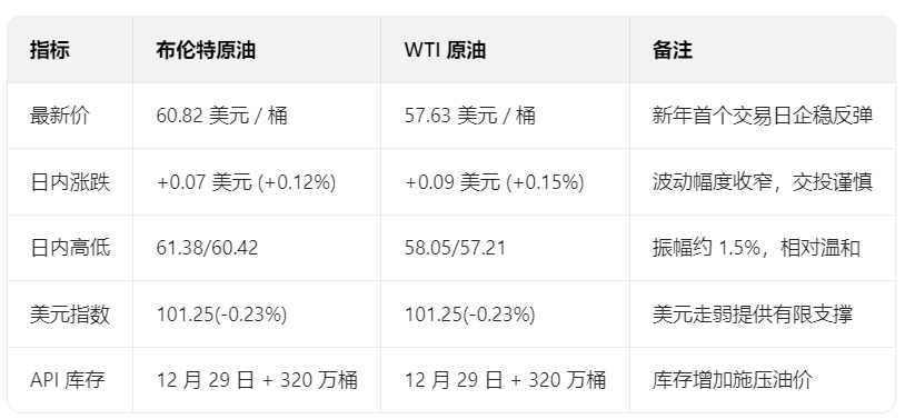 2026年首个交易日,国际原油市场延续低位震荡态势,在经历2020年以来最差年度跌幅后,多空双方围绕关键支撑位展开博弈。截至晚间发稿,布伦特原油期货报60.62美元/桶,日内跌0.48%;WTI原油期货报56.98美元/桶,日内跌0.82%。当前市场核心矛盾集中于OC+政策动向、全球供应过剩压力与地缘风险溢价的博弈,晚间美国经济数