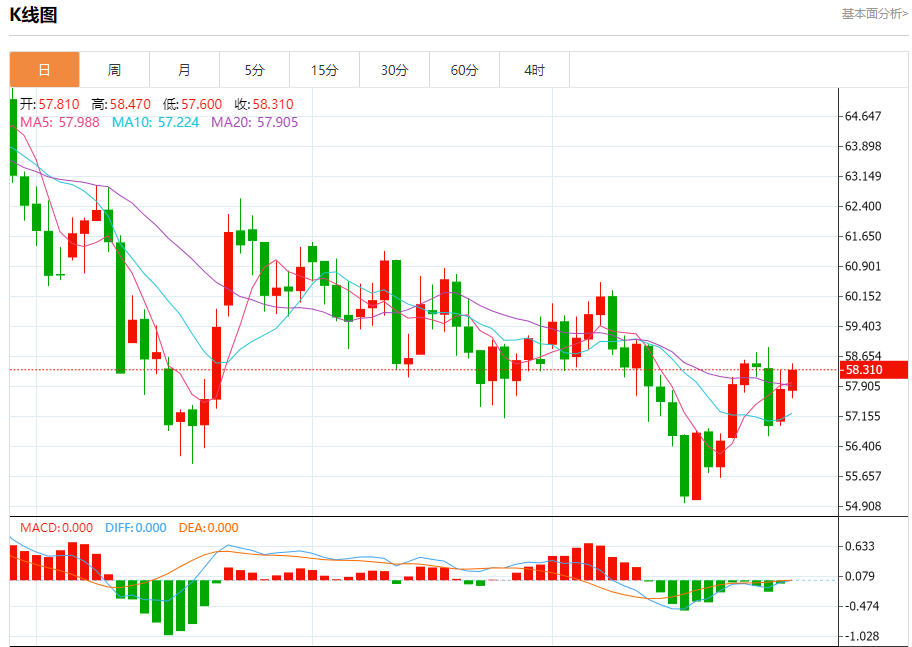 周一盘中,WTI原油报58.020,涨幅2.24%。 今日分析:在57.30之上,看涨,目标价位为58.25,然后为58.85。 技术点评:随后的阻力位是58.25,然后为58.85。 支撑位:57.3057.0556.70 阻力位:59.2558.8558.25 (亚汇网编辑:冰凡)