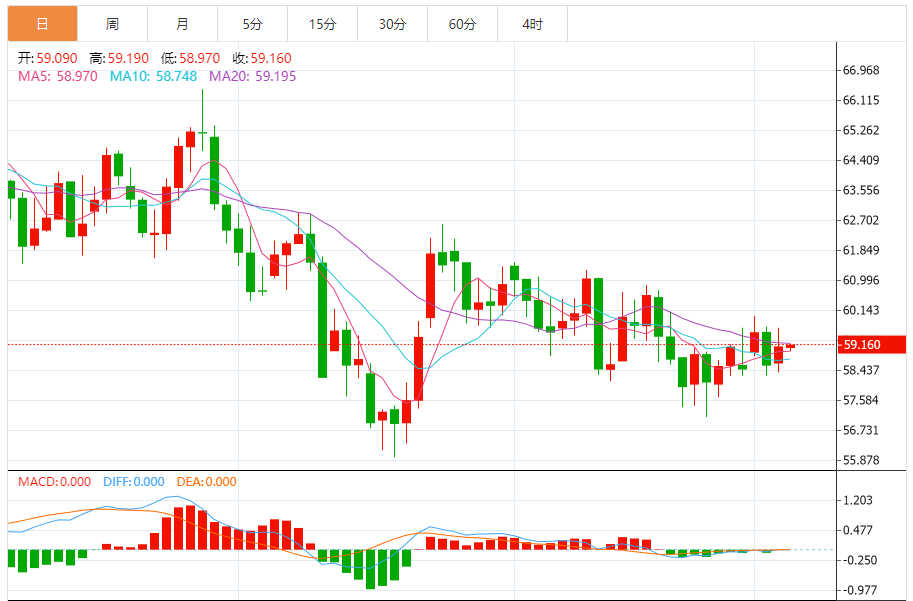 12月4日,原油交投58.83附近。本周IA报告显示需求信号较为温和,原油库存增加57.4万桶,低于预期的190万桶,同时汽油和蒸馏油库存也大幅上涨。 美俄高层会谈未能取得实质性进展,地缘政治紧张局势依然高涨,而全球供应过剩的持续担忧也影响着整体前景。 原油技术分析 从技术角度看,日线图上WTI继续跌破下行趋势线,