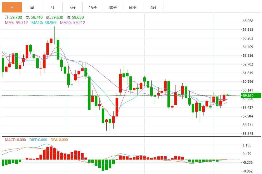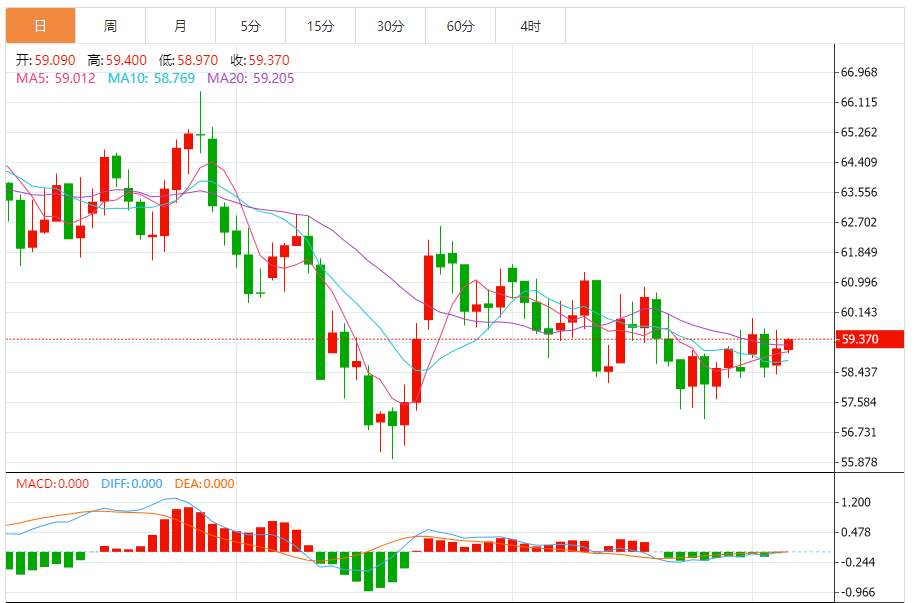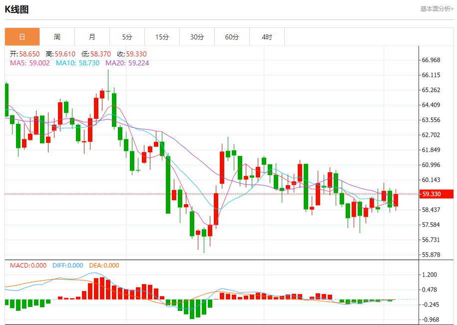 周四盘中,WTI原油报59.350,涨幅0.70%。 今日分析:在58.85之上,看涨,目标价位为59.65,然后为59.95。 技术点评:超短线(当日内)技术指标运行趋势复杂。 支撑位:58.8558.3058.00 阻力位:60.4059.9559.65 (亚汇网编辑:冰凡)