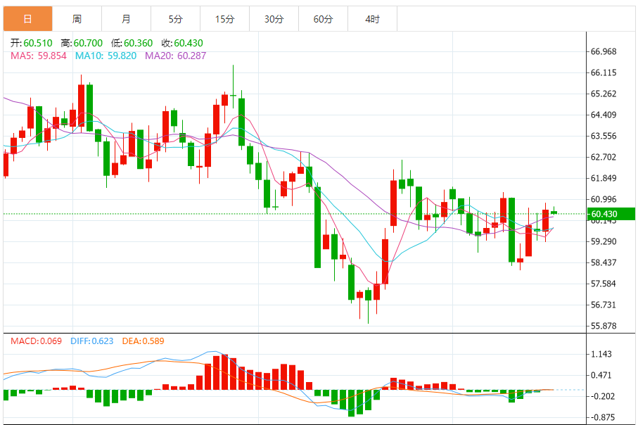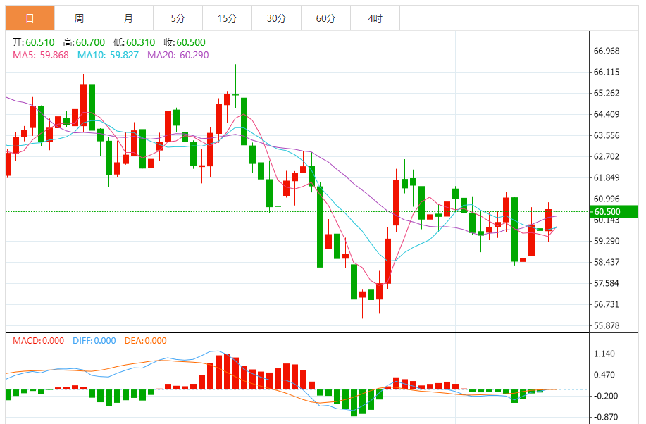 11月19日,周三亚市盘中,原油交投60.46附近。 原油(WTI)周二微幅上涨,约60.50美元,当天上涨近1.35%,尽管供应顺差持续存在担忧。 国际能源署(IA)和美国能源信息署(IA)的最新预测警告称,全球石油市场正处于供过于求的阶段,非欧佩克的产出增长和消费疲软预计将影响到2026年初的经济平衡。 与此同时,随着俄