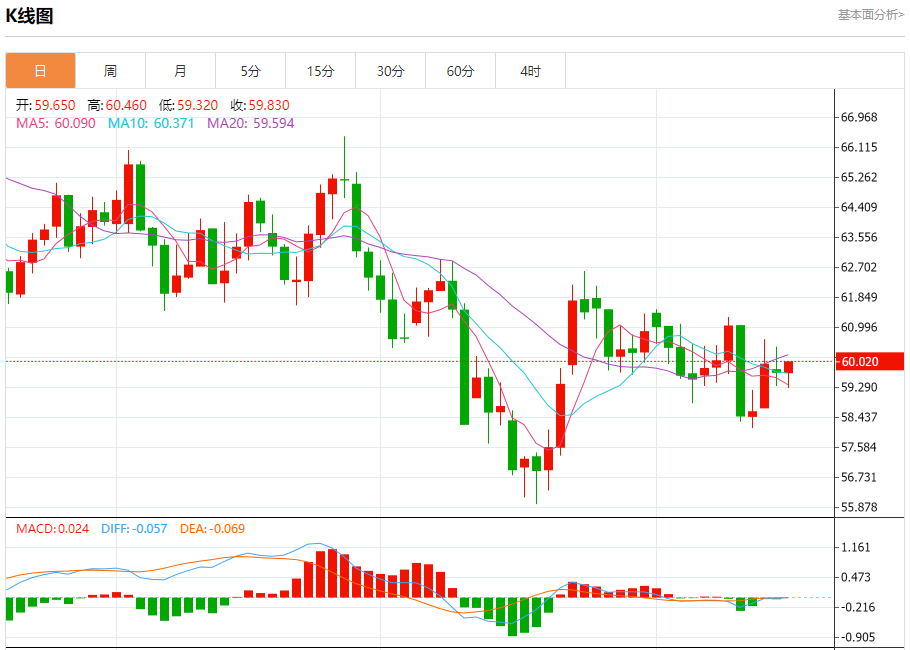 基本消息面 周二(11月18日),美原油价格交投于59.640美元/桶附近,跌幅为0.37%。 相关新闻消息 从近期行情与技术面来看,油价呈现“震荡偏弱、反弹乏力”的特征。此前11月14日,受地缘风险升温推动,WTI原油和布伦特原油曾分别大涨2.39%和2.19%,但涨势未能持续。17日盘中油价一度跌超1%,虽随后