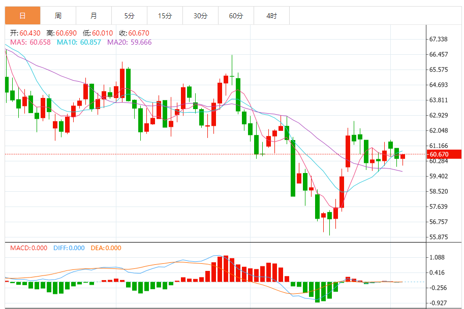 一、行情表现 截至11月5日20时左右,美原油(WTI主力)欧洲时段围绕60.70美元交投,早些时候价格一度靠近60.00美元附近随后回升。而在亚盘时段,西德克萨斯中质原油(WTI)微跌约0.1%,交投于61美元/桶附近。 二、基本面分析 (一)库存因素 最新一周的行业协会数据显示,美国商业原油库存
