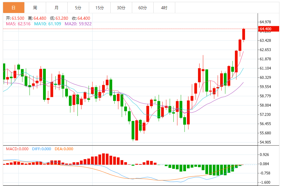 1月29日,原油(WTI)油价连续第三个交易日上涨,周四欧洲早盘时段交易时段约为每桶64.00美元。由于美伊地缘政治紧张局势引发供应风险上升,WTI原油价格飙升至四个月来的最高点。 美国警告称,如果伊朗未能达成核协议,可能会采取军事行动,这加剧了对供应中断的担忧。美国总统唐纳德·特朗普表示,美国在该地区的强大