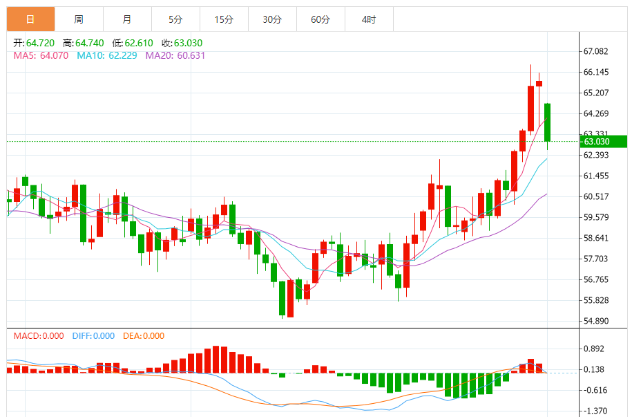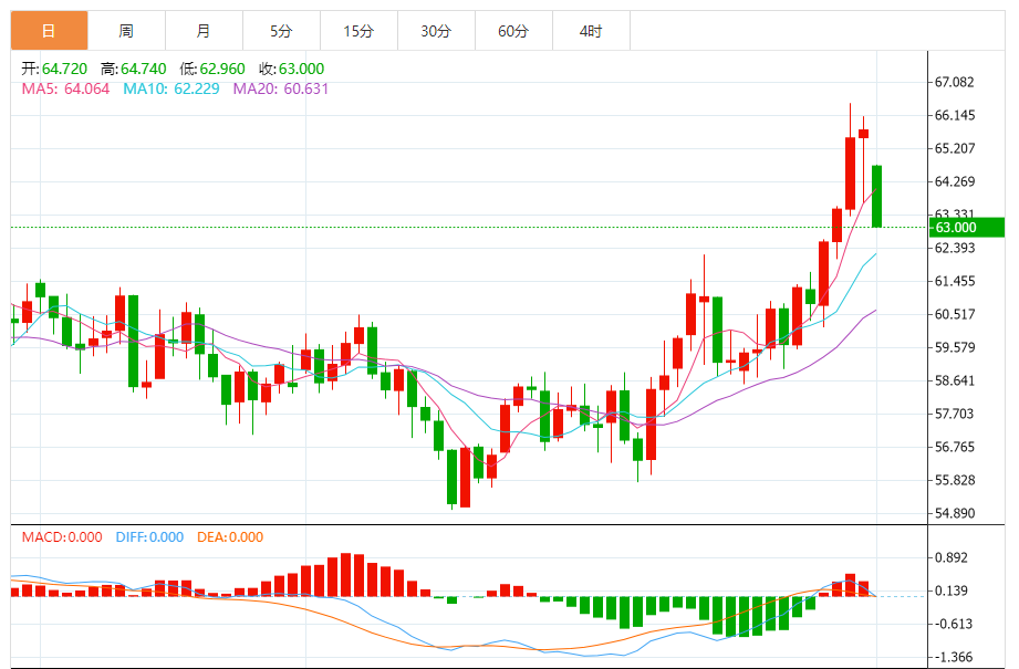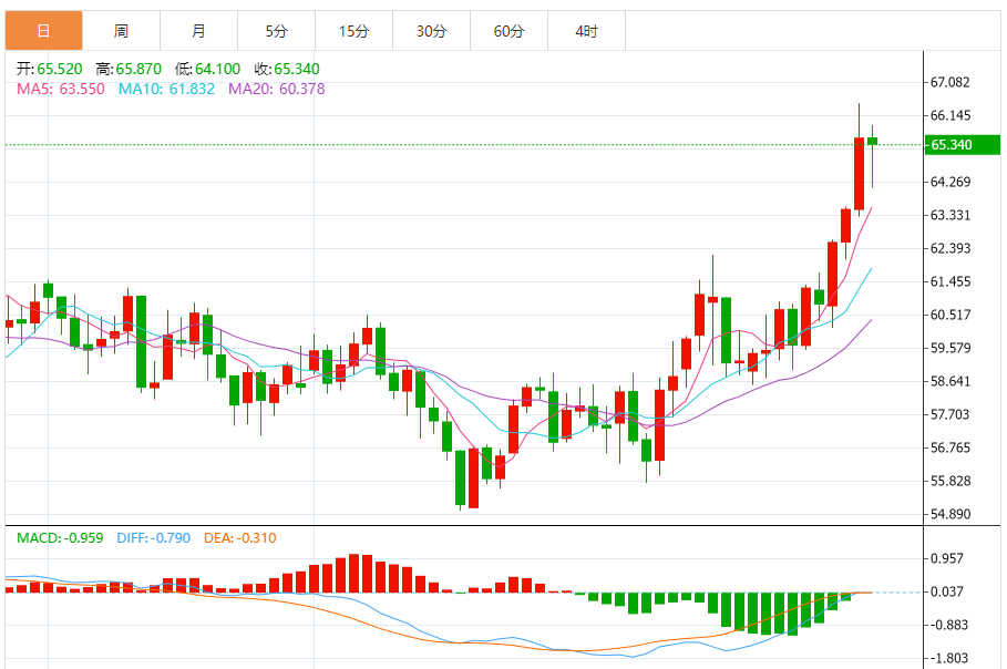 截至1月30日22时15分,国际油价冲高回落,呈现高位震荡整理态势。WTI原油报64.69美元/桶,日内跌幅1.25%,开盘65.52美元/桶,最高触及65.87美元/桶,最低下探64.10美元/桶;布伦特原油报68.98美元/桶,日内跌幅1.05%,开盘69.63美元/桶,未能守住前一交易日70.71美元/桶的高位。国内C原油06合约报475.9元/桶,日内震荡于