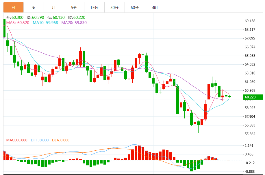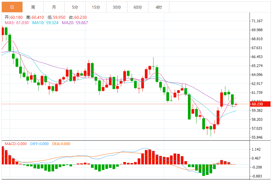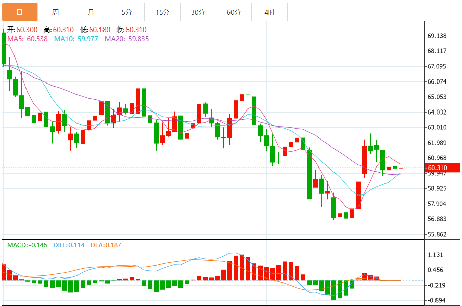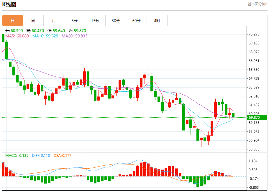 一、日间行情复盘:数据与政策的“过山车”博弈 10月30日原油市场呈现“数据提振冲高、政策压制回落”的剧烈震荡格局。截至欧盘尾盘(20时00分),WTI原油报60.02美元/桶,较开盘价下跌0.61%,日内波动区间59.87-60.73美元;布伦特原油报64.05美元/桶,较开盘价下跌0.34%,波动区间63.92-64.88美元。 行情