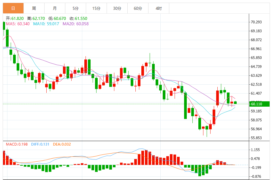 基本消息面 周四,国际油价小幅下跌,并未能延续昨日上涨。WTI原油交投于60美元/桶附近,此前反弹主要受到美国库存意外大幅下降及制裁因素的共同推动。 相关新闻消息 美国能源信息署(IA)公布的数据显示,上周美国原油库存减少690万桶,降幅远超市场预期,为近两个月来最大单周下滑。 同时