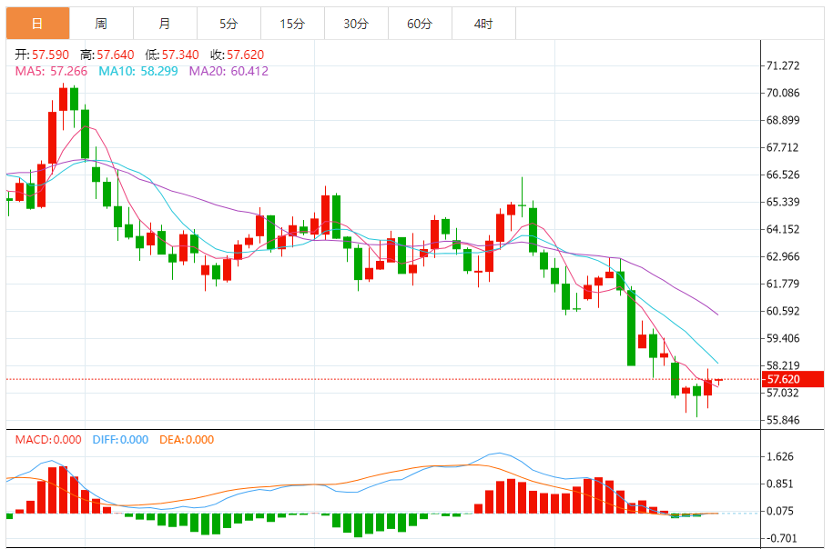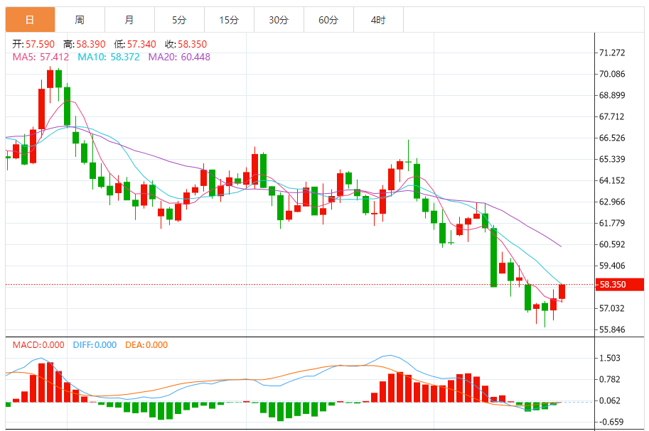 周三(10月22日),美原油价格交投于58.330美元/桶附近,涨幅为1.92%。 原油在最后一次盘中交易中小幅收涨,得益于相对强弱指标出现的积极信号,在消化超买状态后提供了暂时的动能,帮助其实现了这些微幅上涨。这种看涨交易表明市场在表现相对疲弱之后试图重新获得看涨动能。 价格仍面临57.80美元的强阻力