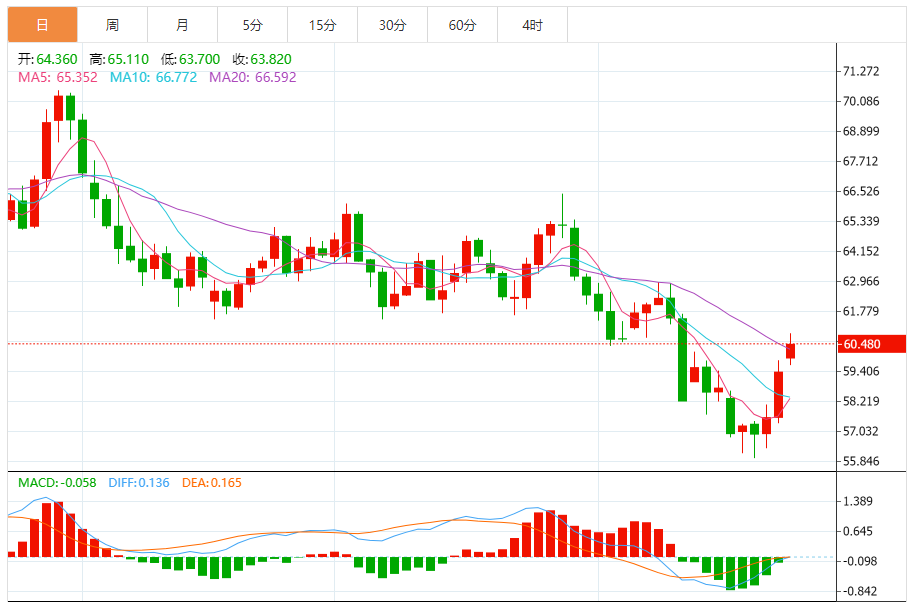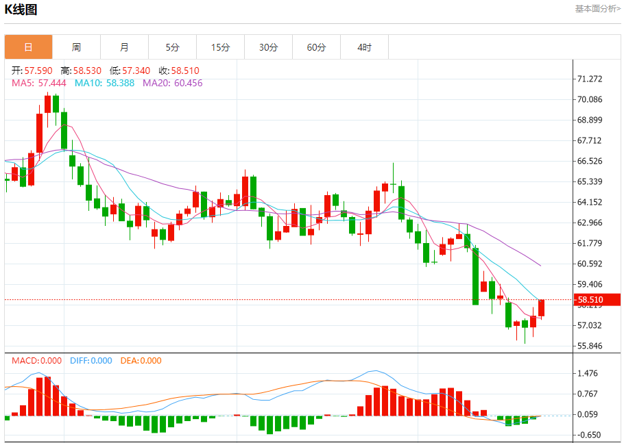 基本消息面 油价上涨,因为技术指标预示近期跌势过度,而美国政府报告显示原油库存下降,这缓解了市场对供应过剩的担忧。WTI上涨2.2%,收于每桶58美元上方,预示原油的相对强弱指标在连续约一周处于超卖区间后进入回调阶段。布伦特上涨2%,收于每桶63美元下方。 相关新闻消息 美国政府数据显示石油