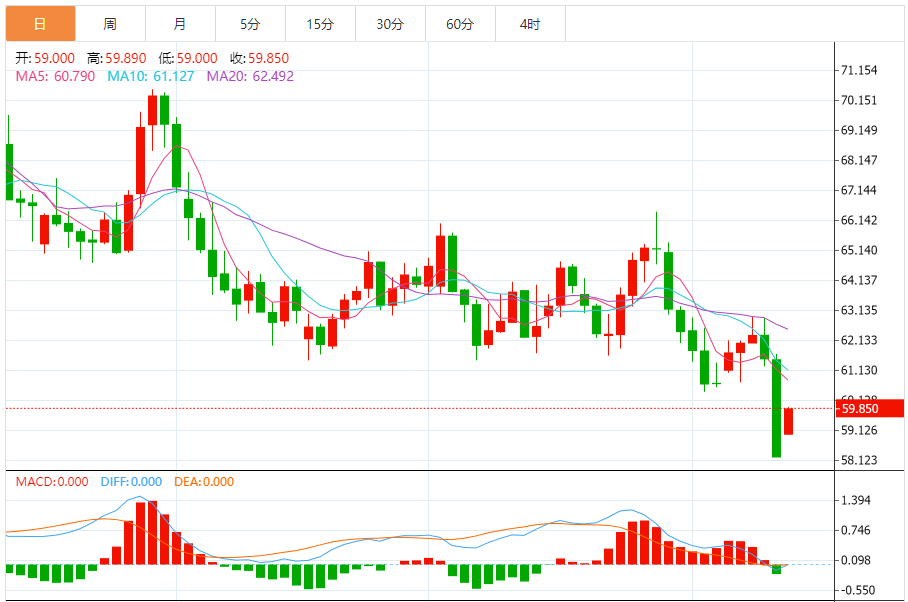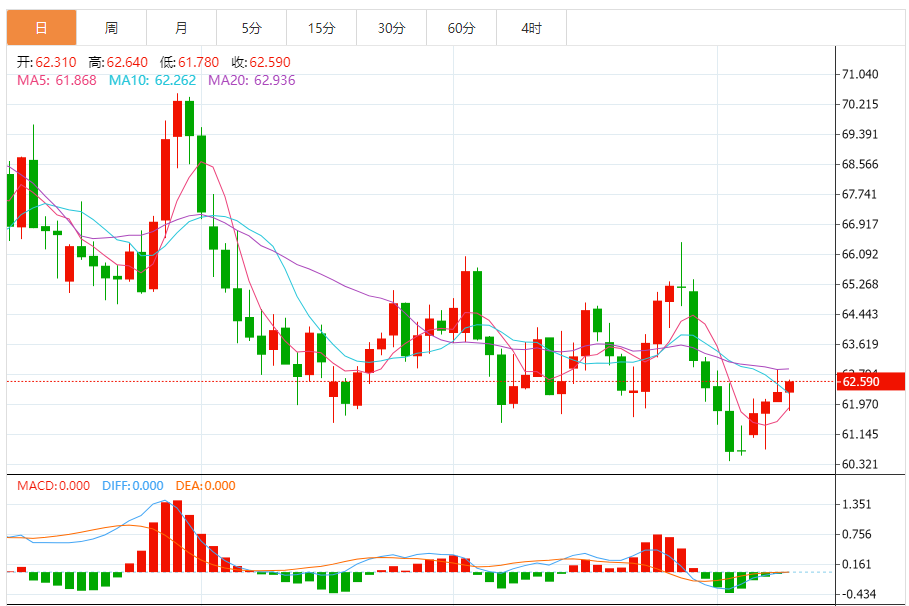 基本消息面 周一,国际油价小幅回升。布伦特原油升至每桶63美元上方,WTI原油稳定在60美元附近。此前,上周五因贸易紧张局势再度升温,两种原油品种均录得自8月以来最大单日跌幅,布伦特下挫3.8%,WTI跌破60美元关口。 相关新闻消息 芝加哥KarobaarCaitalL首席投资官HariKhurhid表示:“市场此前已