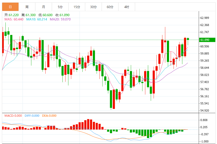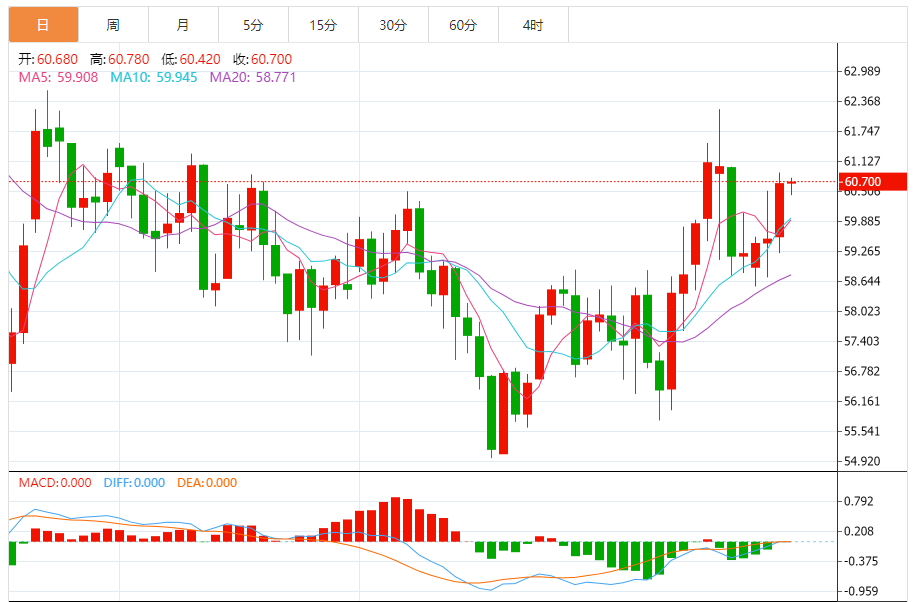 基本消息面 周四,美原油延续上涨,交投于60.60美元/桶附近,短期再次测试前期高点,有望向上突破。 相关新闻消息 基本面上国际能源署(IA)在最新月度原油市场报告中指出,全球原油需求前景有所改善,将今年需求增长预期从此前的86万桶/日上调至93万桶/日,略高于去年的85万桶/日增幅,这反映出全