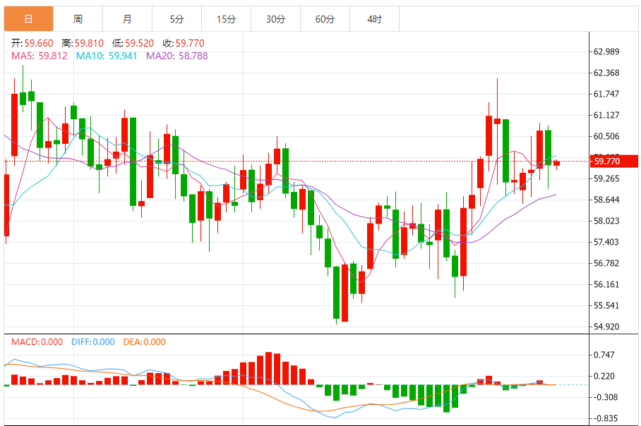 截至发稿,WTI原油报59.48美元/桶,日内微涨0.20%;布伦特原油报64.21美元/桶,日内微涨0.23%。日内走势呈现"低位震荡、企稳回升"格局,亚盘在59.00美元附近获得支撑后缓慢反弹,欧盘维持窄幅整理,晚间将迎来美国核心C数据这一关键催化剂,60美元整数关口成为多空博弈的核心战场。 一、技术面深度解析:空头格局