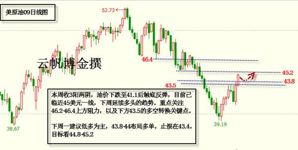 上周收3阳2阴,周一的上涨,周二的触顶回落,周三的延续下跌,周四的触底反弹,周五的延续上涨。形成了一副上涨过程中的回撤确认,回撤的低点在41.1一线。云帆是预料到了这是一波回撤确认,只是没想到会这么快的来临,预计是在更低点位39.5-40区域才会重新开始反弹。沙特的讲话对油价提振的效果是有目共睹,OPEC再次减产会议将是后面所关注的重点,但是近期的原油供应的基本面并不支撑油价上涨。目前来看,油价仍在进一步上涨,自41.1反弹至临近45美元的位置,日内短线的话,依旧是回落多,至少多头的趋势依旧强势,就不能顶着多头去做空,但是上涨的背后,我们也要考虑空头的打压,这波多头直接上冲突破6月初的51.6美元高点位置的可能性不大,预计会于46-50美元止步,随后下行。至少是跌至41.1美元的位置。油价近期的多空反复让投资者疲乏,不知多空该如何去把握,但是将目光放长远,还是很容易看清的。