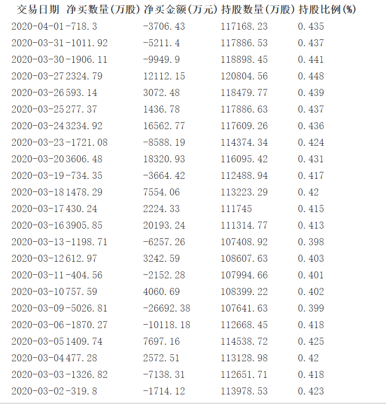 港资4月1日,净卖出718.3万股,约3706.43万元,减持比例:0%,成交占比:7.052%,持股比例:0.435%,连续3个交易日减持,近5个交易日持股比例无变化,近20个交易日比例变化:2.381%,近60个交易日比例变化:-12.245%。 近一月港资持股变动如下:
