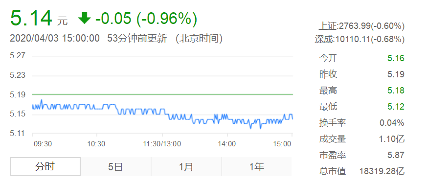 4月3日工商银行股票收盘价5.14跌幅0.96%。