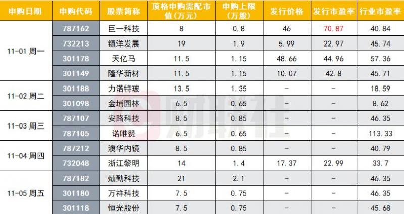 根据发行安排,下周(11月1日-11月5日)有13只新股发行,包括科创板5只、沪市主板2只、创业板6只。具体日程安排上,下周集中申购在周一和周五,周一可申购巨一科技、镇洋发展、天亿马、隆华新材4只个股,周五可申购灿勤科技、万祥科技、恒光股份3只个股。