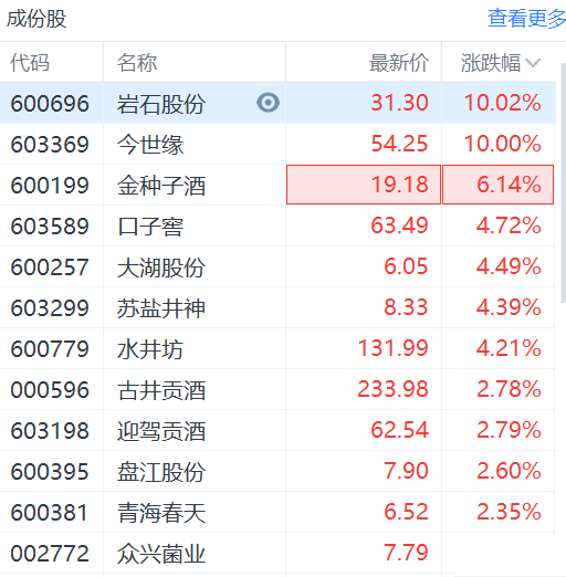 今世缘、岩石股份涨停,金种子酒涨超6%,大湖股份、苏盐井神、口子窖、水井坊涨超4%,古井贡酒、迎驾贡酒涨超2%。