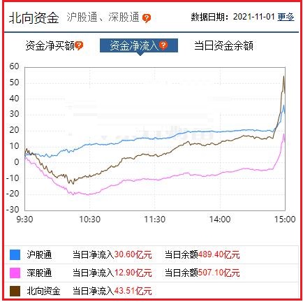 截至收盘: 北向资金净流入43.51亿元,其中沪股通资金净流入30.60亿元,深股通资金净流入12.90亿元。