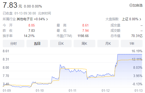 重要资讯:沪深交易所2023年01月13日公布的交易公开信息显示,盈方微因成为当日涨幅偏离值达7%的证券上榜。盈方微当日收报8.61元,涨跌幅9.96%,偏离值9.1%,换手率14.21%,成交额7.29亿元。