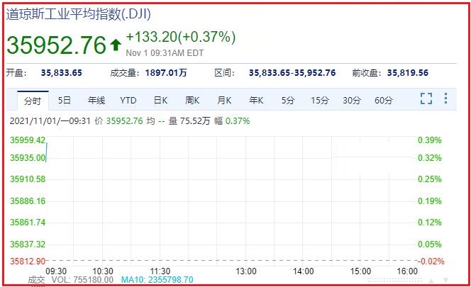 1、截止发稿时间,道琼斯报于:35990.93,成交量:2214.56万
