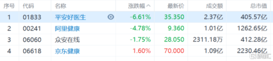 互联网医疗股续跌,平安好医生跌6.61%,阿里健康跌近5%。