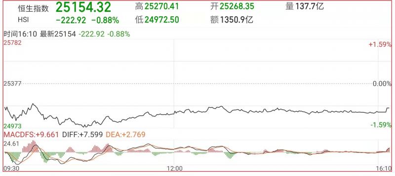 1.恒指昨早市先低开109点至25268点,其后再进一步反复偏软,恒指持续反复于24972点至25270点之间,午后恒指继续窄幅震荡。截至收盘,恒指收跌0.88%录得5连跌。国企指数跌0.7%,红筹指数跌0.34%;