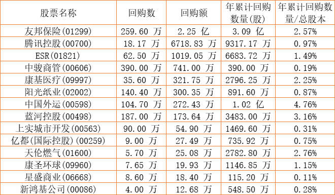 天福(06868)、上实城市开发(00563)、和谐汽车(03836)、新鸿基公司(00086)、中国外运(00598)、亿都(国际控股)(00259)、腾讯控股(00700)、天伦燃气(01600)、清科创业(01945)、阳光纸业(02002)、蓝河控股(00498)、友邦保险(01299)、星盛商业(06668)、康圣环球(09960)、ESR(01821)、康基医疗(09997)、中骏商管(00606)于2023年1月11日进行了回购。其中,回购金额最大的为友邦保险(01299),回购数量259.60 万,回购金额2.25 亿元。