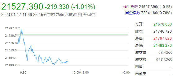 1月17日消息,今日开盘,港股恒指低开0.32%,随后跌幅扩大。截至午间收盘,恒生指数跌1.01%,报21527.39点;国企指数跌0.76%,红筹指数跌0.81%。