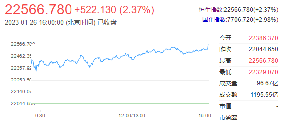 大型科技股霸气领涨再创反弹新高,小米集团一骑绝尘大涨超12%,腾讯涨3.83%时隔11个月再次站上400港元,市值逼近3.9万亿大关。特斯拉Q4业绩超预期,且维持了15%的净利润率,推动造车新势力股全天强势,蔚来涨约13%,理想汽车涨超12%,小鹏汽车涨超10%。2023春节档票房破50亿,影视股集体走高,IMAX中国涨超6%,猫眼娱乐涨超3%;春节档票房第一的《满江红》的背后主控和主要出品方欢喜传媒大涨超10%。内地旅游业需求强劲反弹,兔年春节前4天,数据显示旅游多业态已反超2019年同期,旅游、酒店、餐饮等消费板块悉数上扬,中国中免涨超8%创上市以来新高,携程、海底捞涨超2%。半导体板块午后涨幅明显扩大,华虹半导体涨超6%,中芯国际涨超3%。券商、银行、保险等大金融板块携手拉升,内房、物管股齐头并进,苹果概念、特斯拉概念、汽车产业链等板块全线上涨。
