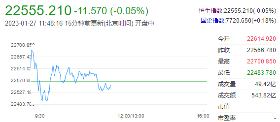 1月27日,港股半天下来,指数震荡走弱,恒生指数跌0.05%,报收22555.21点;恒生科技指数涨0.22%,报收4774.04点。