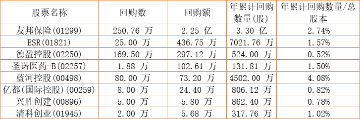德盈控股(02250)、兴胜创建(00896)、清科创业(01945)、蓝河控股(00498)、友邦保险(01299)、亿都(国际控股)(00259)、ESR(01821)、圣诺医药-B(02257)于2023年1月26日进行了回购。其中,回购金额最大的为友邦保险(01299),回购数量250.76 万,回购金额2.25 亿元。
