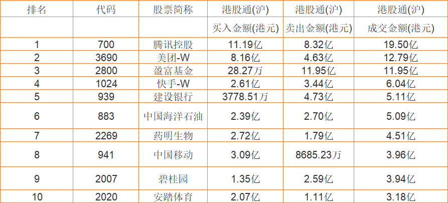港股通(沪)买卖前十股(单位:港元):