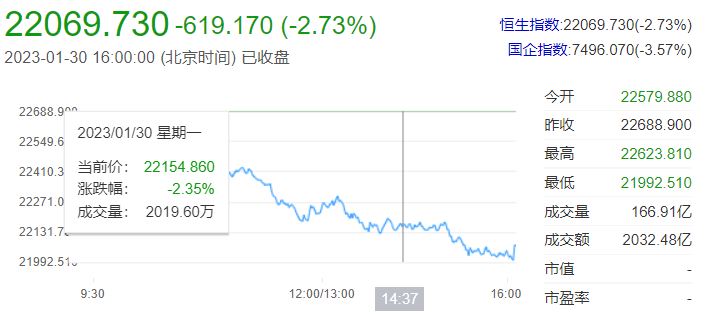 港股兔年上周迎来开门红,今日三大指数大肆回调,恒生科技指数大跌4.84%表现最差,恒指、国指分别跌2.73%和3.57%,恒指重挫超600点,三者均抹平上周2个交易日的涨幅。盘面上,权重科技股阿里巴巴下挫7%,腾讯大跌6.7%失守400港元大关,小米、快手、京东均跌超5%;旅游及观光股、电影概念股、餐饮股等消费概念全天领跌,且均呈高开低走行情,内险股、中资券商股、内银股齐跌,令大市进一步承压。另一方面,军工股全天维持强势,消息指香港未来几日或免核酸通关,香港本地股多数上涨,港铁公司、长和逆势涨近2%。南下资金净流出37.19亿港元,大市成交额放大至超2000亿港元。