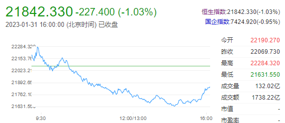 港股尾盘拉升,三大指数跌幅快速收窄仍全线收跌,录得2日回调。恒生科技指数一度跌至2.4%,最终下跌0.82%,恒指、国指分别跌1.03和0.95%。1月收官,三大指数均涨10%。