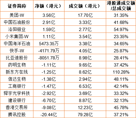 亚汇网1月31日港股通数据统计显示:美团-W净买入额居首,达3.56亿港元,腾讯控股净卖出额居第一位。(亚汇网编辑:陌尘)