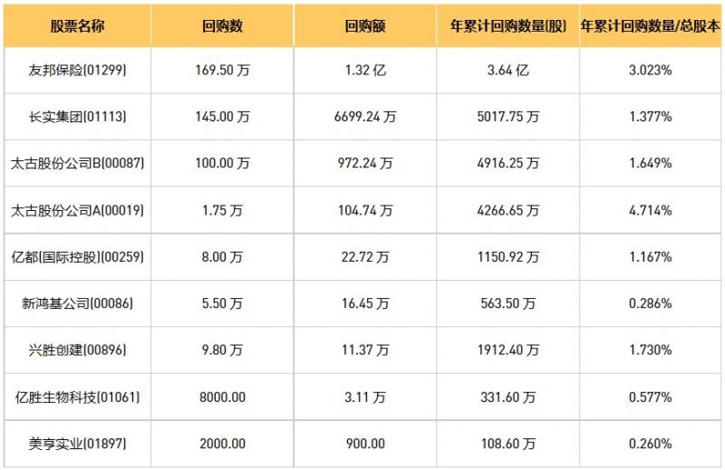 亿胜生物科技(01061)、新鸿基公司(00086)、太古股份公司A(00019)、太古股份公司B(00087)、亿都(国际控股)(00259)、友邦保险(01299)、长实集团(01113)、兴胜创建(00896)、美亨实业(01897)于2023年3月17日进行了回购。其中,回购金额最大的为友邦保险(01299),回购数量169.50 万,回购金额1.32 亿元。