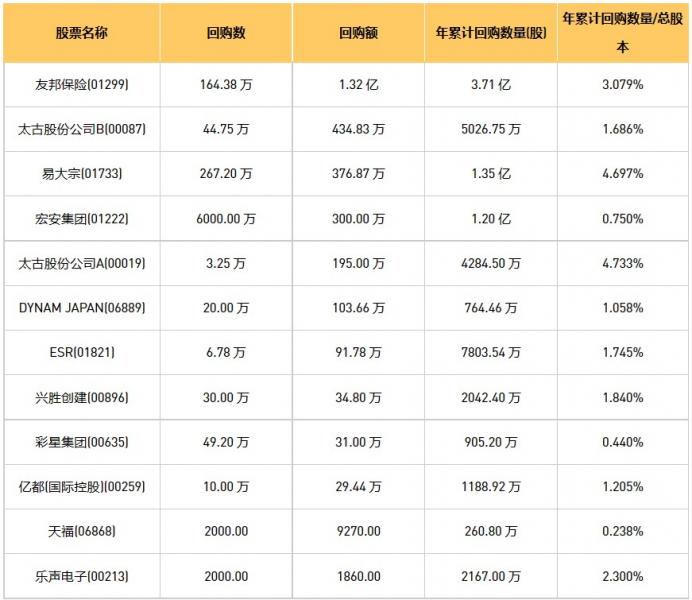 彩星集团(00635)、天福(06868)、宏安集团(01222)、DYNAM JAPAN(06889)、兴胜创建(00896)、友邦保险(01299)、太古股份公司A(00019)、亿都(国际控股)(00259)、太古股份公司B(00087)、乐声电子(00213)、易大宗(01733)、ESR(01821)于2023年3月23日进行了回购。其中,回购金额最大的为友邦保险(01299),回购数量164.38 万,回购金额1.32 亿元。