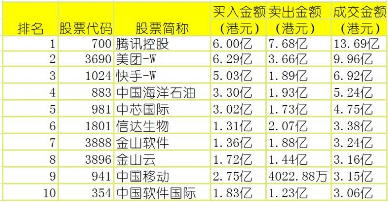 亚汇网3月30日港股通数据统计显示:腾讯控股成交额居首,达13.69亿港元