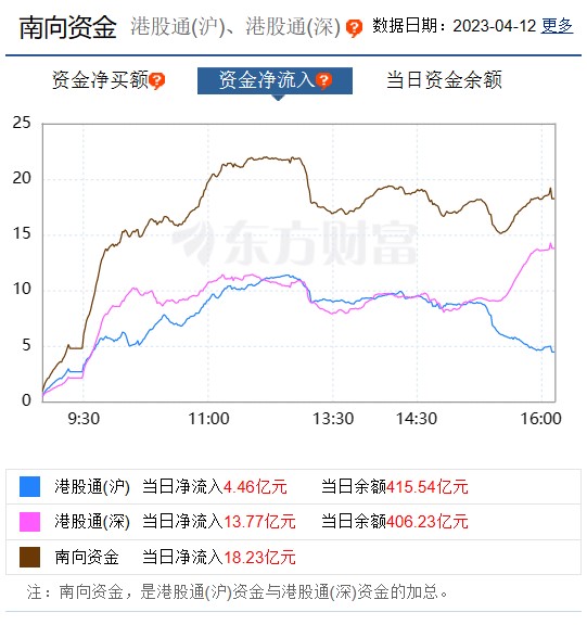 截至4月11日港股收盘,南向资金全日合计净流入逾18.23亿港元。其中,沪市港股通净流入4.46亿港元,深市港股通净流入13.77亿港元。