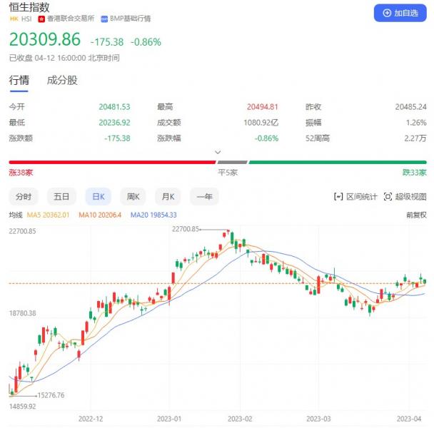 香港恒生指数开盘跌0.02%,全天震荡走低。截至收盘,恒生指数跌175.38点或0.86%,报20309.86点,全日成交额达1080.92亿。国企指数跌1.21%,报6866.5点,红筹指数涨0.42%,报4090.59点。